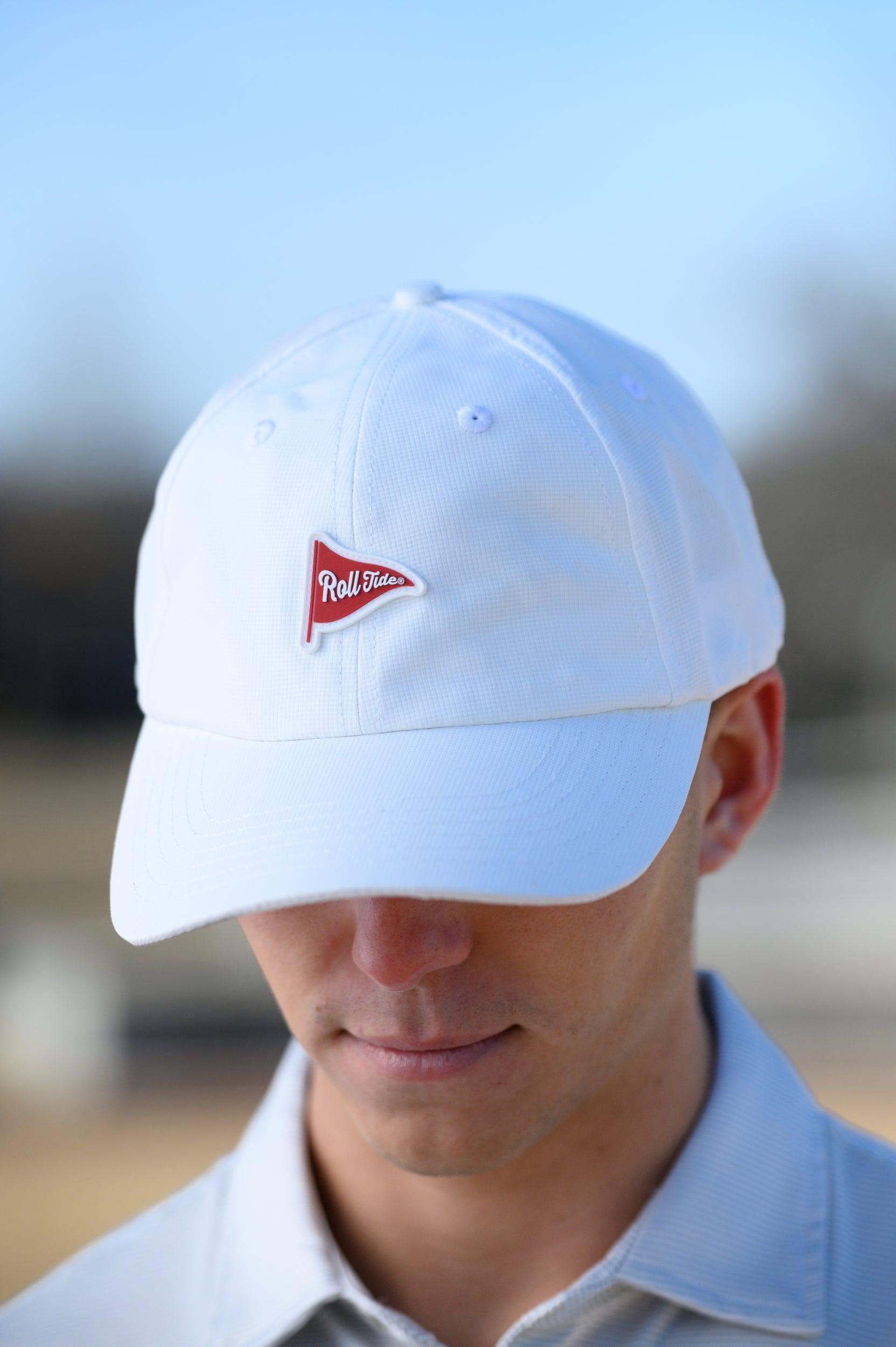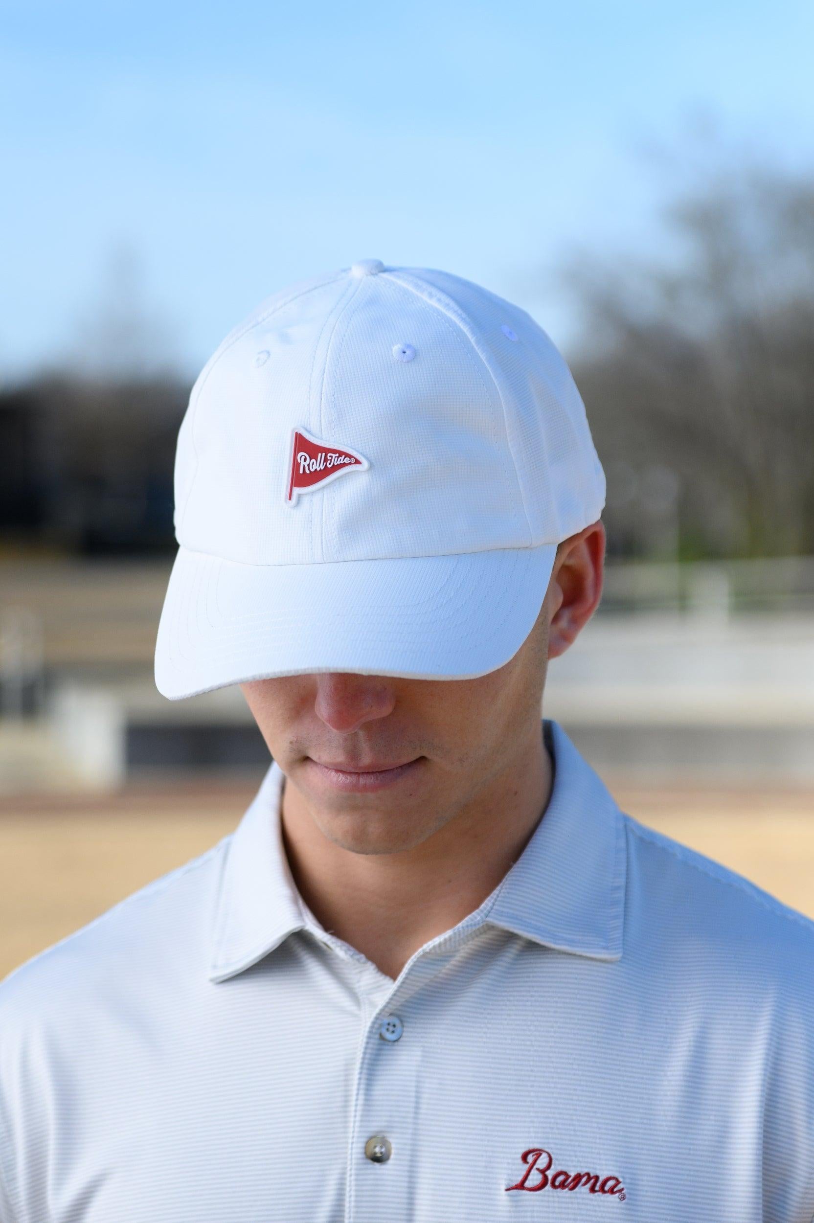 Your golf game has never looked so good! Made of moisture-wicking performance fabric our very own Alabama Performance Flag Hat will keep you cool (and looking good) for all 18-holes. It's all in the details. We've decorated it with a pennant flag rubber patch.
