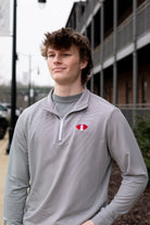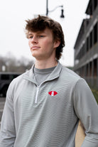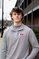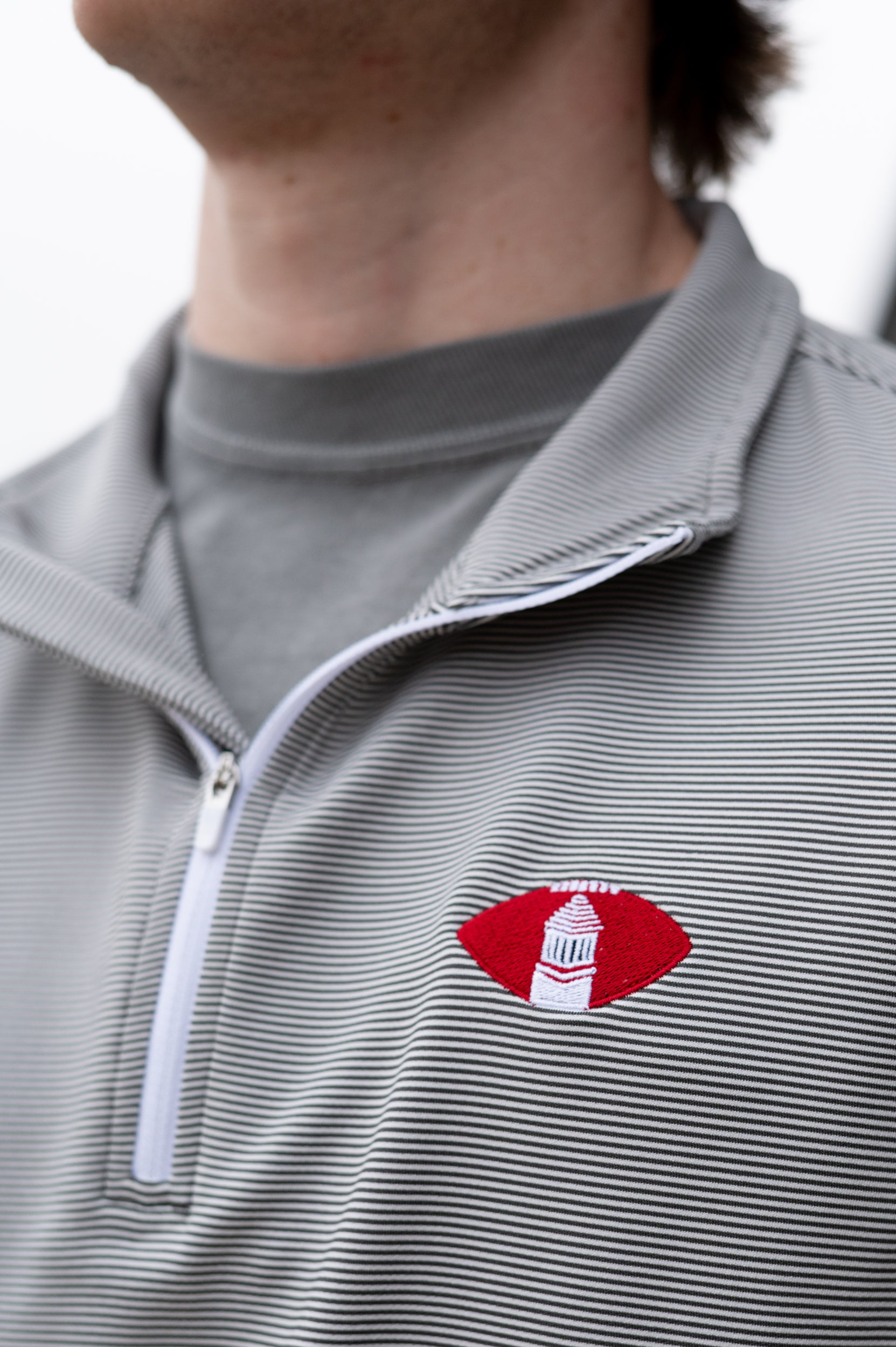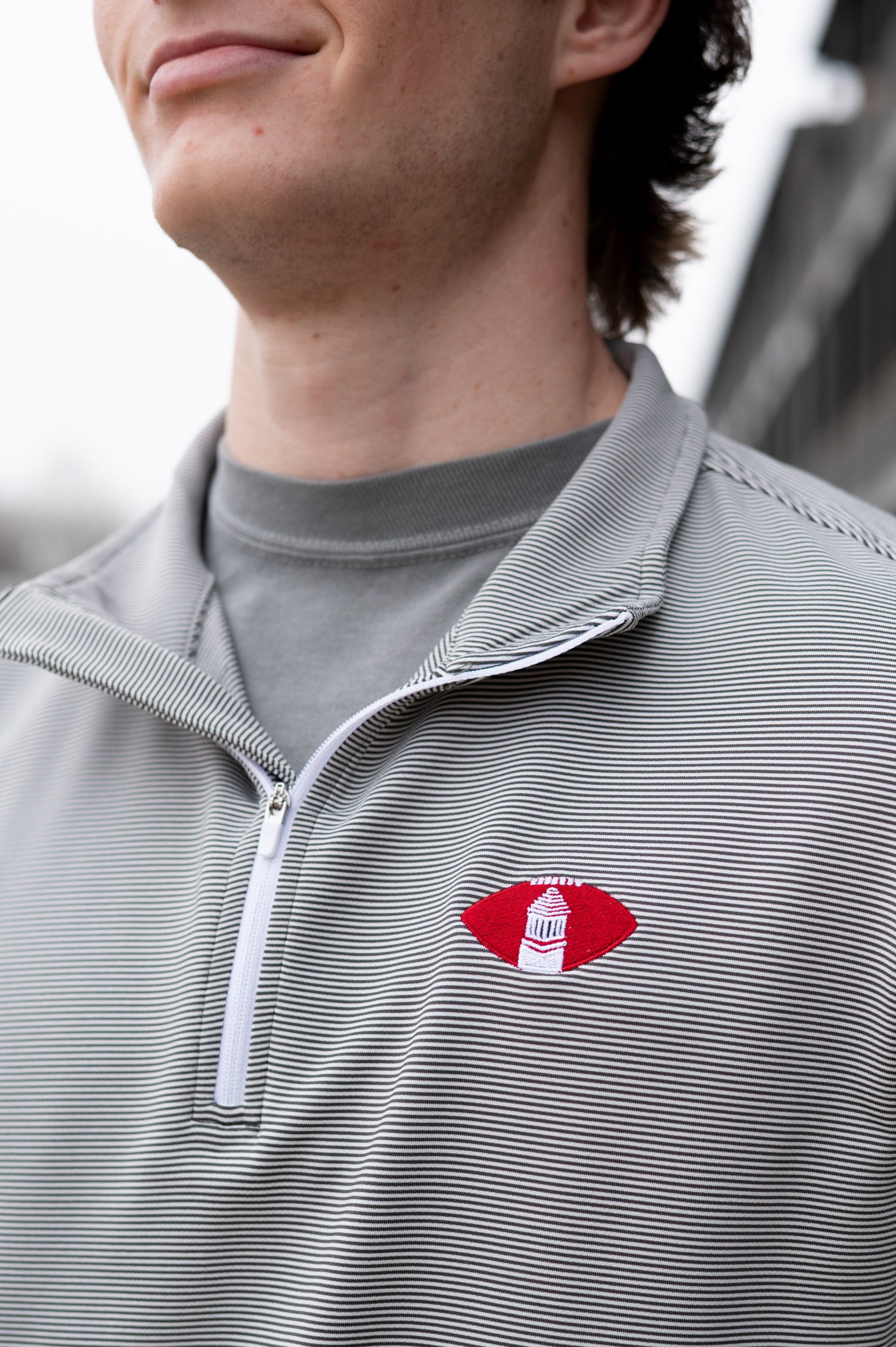 Upgrade your University of Alabama gameday apparel with our Denny Chimes Football 1/4 Zip Pullover! It is a classic piece embroidered with a vintage-inspired Alabama logo featuring a football and Denny Chimes. It will be your new favorite performance pullover! The charcoal and white stripe quarter zip decorated with Denny Chimes Football logo embroidery is perfect for Alabama gameday. Our light-weight, quick-dry performance fabric provides ultimate comfort in the Alabama heat.