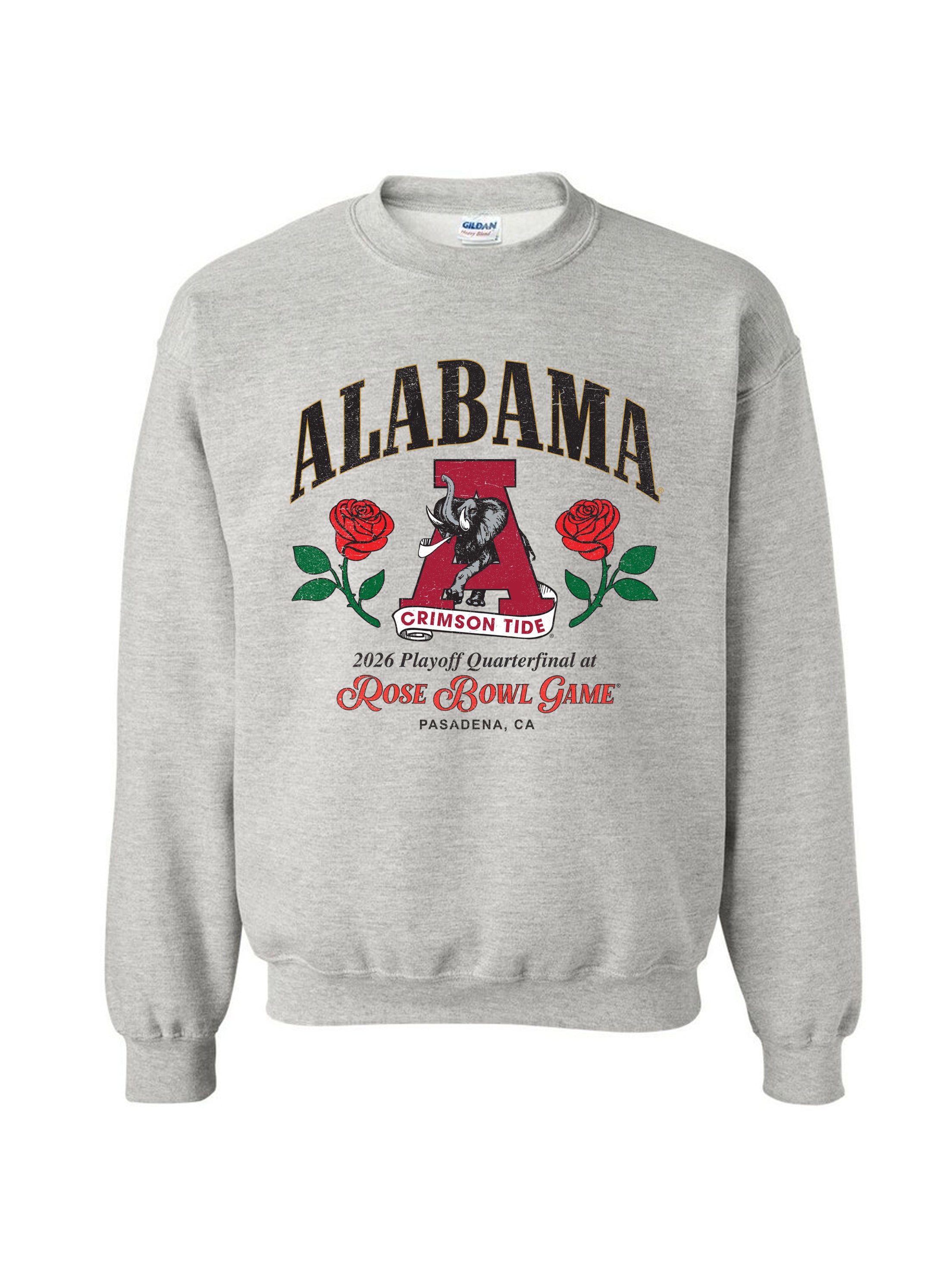 Our limited edition Retro Alabama Football crewneck features the Vintage A University of Alabama logo and roses commemorating the 2026 CFP Quarterfinals matchup between the Crimson Tide and Indiana Hoosiers in Pasadena, CA.  This classic design is printed on the front of a comfy oversized Gildan unisex fleece crewneck with subtle distressing for a soft, retro look and feel.