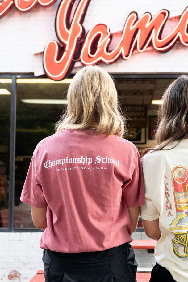 We're a Championship School. It doesn't take many words to describe the expectations and legacy of the championship program at the University of Alabama. This Comfort Colors t-shirt has a minimal design that makes a statement! It is a favorite for a reason with the vintage inspired font and the official school seal on the pocket.